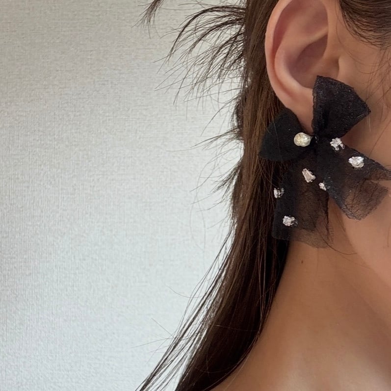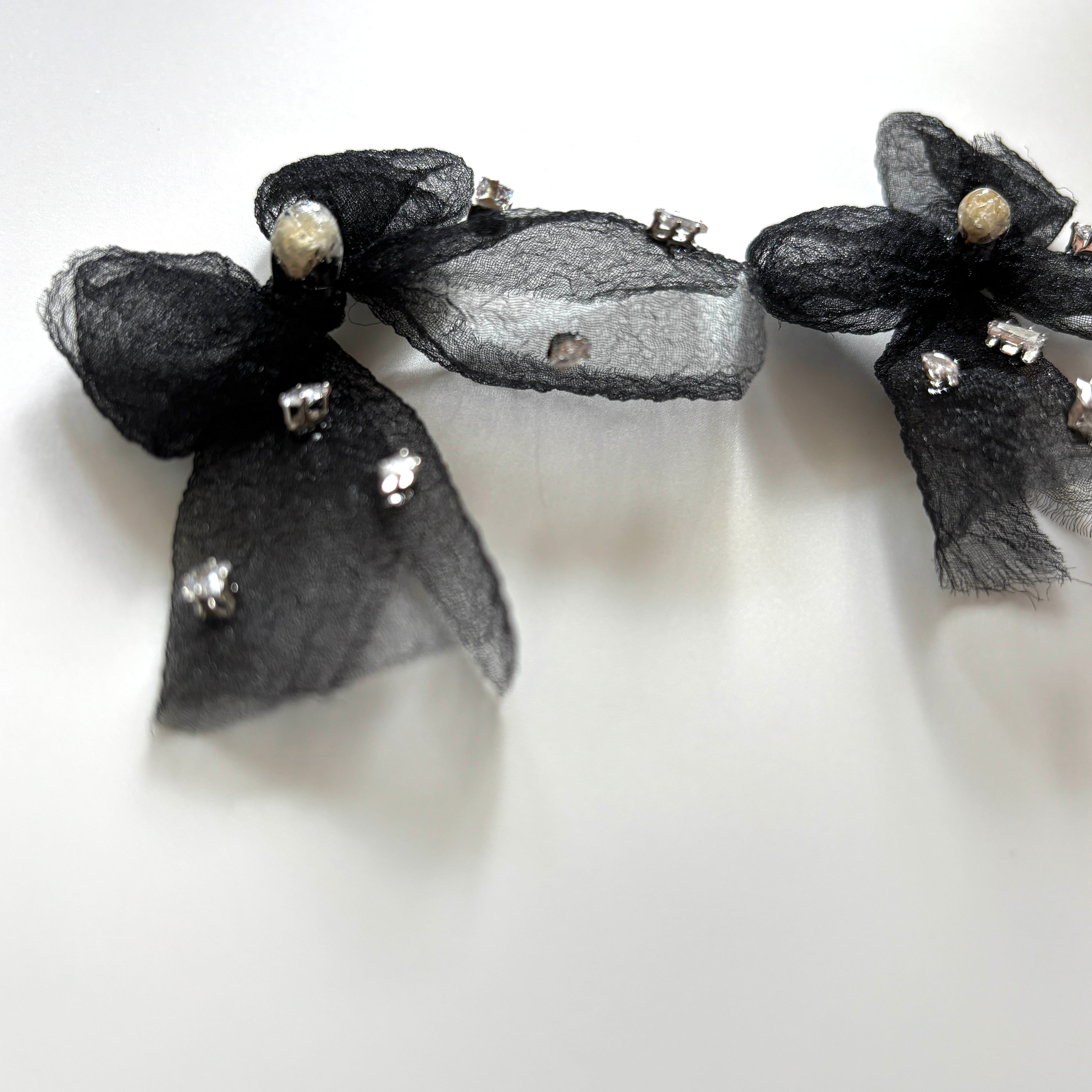 透け感のあるオーガンジーリボンにビジューを散りばめたピアス。